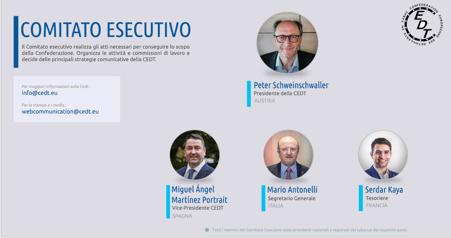 Lo scopo principale della CEDT è quello di promuovere gli interessi di circa 130.000 dettaglianti di tabacco europei, professionisti al servizio dello Stato e dei cittadini, ai quali garantiscono la legalità del circuito di vendita, la genuinità e la qualità di prodotti peculiari come quelli del tabacco, per un consumo adulto e consapevole, nel rispetto delle norme nazionali ed europee in materia sanitaria.